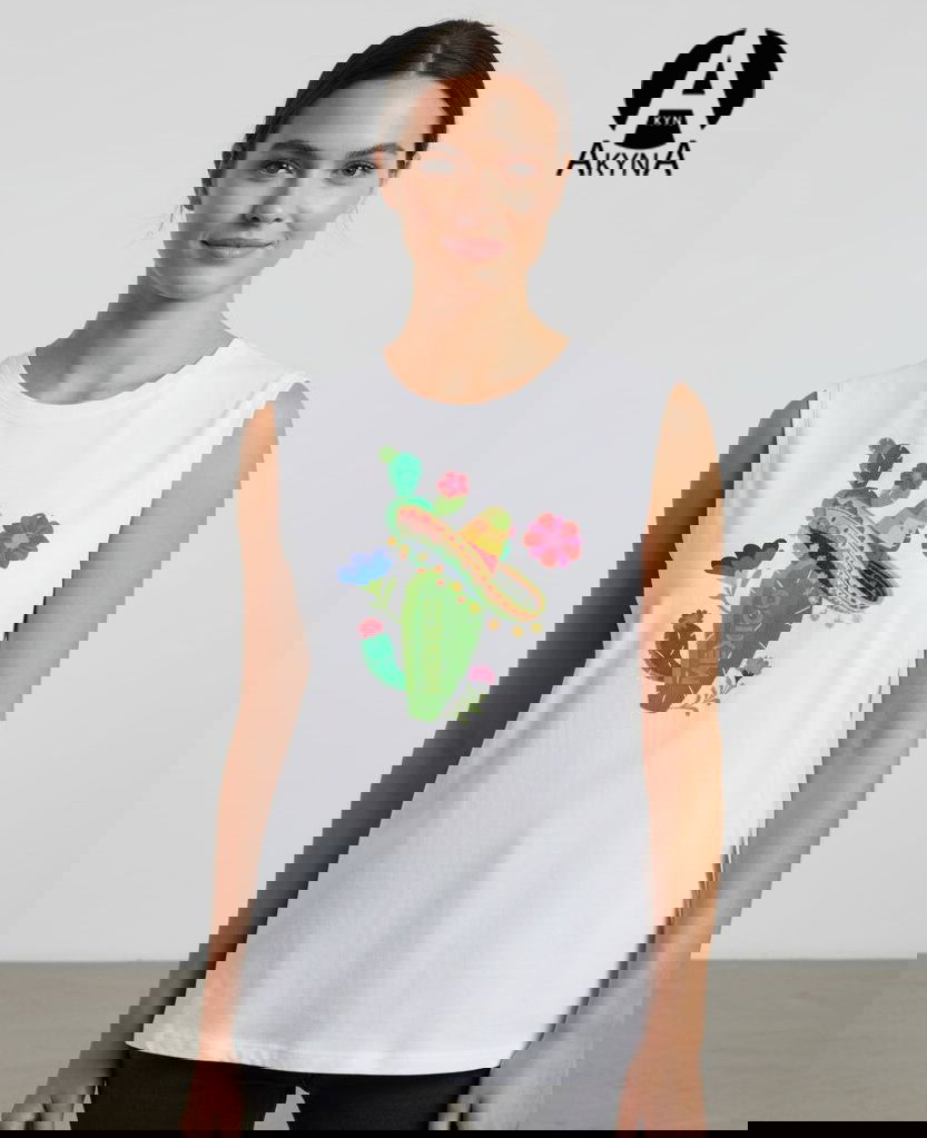 Remera musculosa, confeccionada en modal soft . Se destaca su estampa única de la colección realizada en el frente de la prenda.